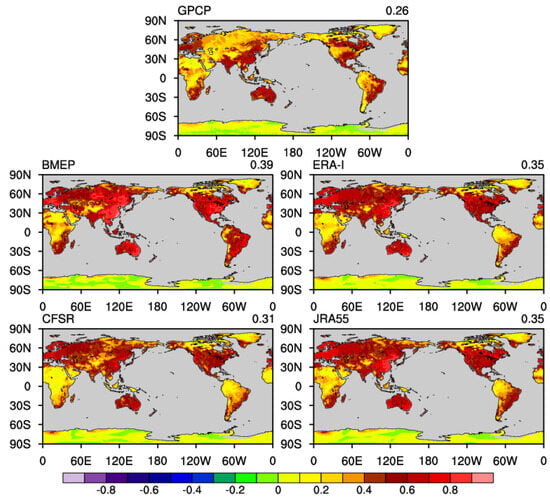 The BMEP data demonstrate a clear advantage in terms of spatial correlation coefficients compared to other grid-based precipitation products. On a global land average, the spatial correlation coefficients of BMEP data remain consistently above 0.6, significantly higher than those of JRA-55 (0.52), ERA-I (0.48), GPCP-1DD (0.42), and CFSR (0.44). In both the global land area and the Northern Hemisphere land area, JRA-55 precipitation data exhibit higher spatial correlation coefficients compared to ERA-I, CFSR reanalysis data, and GPCP-1DD data. Meanwhile, in the Southern Hemisphere, JRA-55 and ERA-I data display similar levels of spatial correlation coefficients, outperforming GPCP-1DD and CFSR data, with CFSR data exhibiting the poorest performance in terms of spatial correlation coefficients.