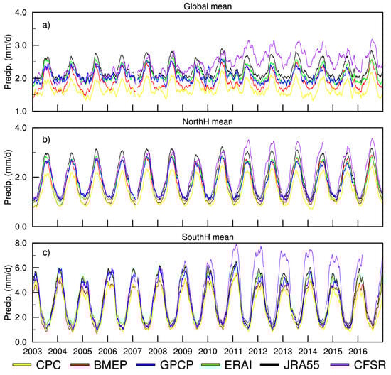 The time series of daily precipitation over the (a) global land area (60°S–90°N), (b) northern hemisphere land area (0°N–90°N), and (c) southern hemisphere land area (60°S–0°S) for CPC-U data and each gridded daily precipitation datum from 2003 to 2016. (A 31-point smoothing was applied to all lines to enhance the distinguishability of the lines).