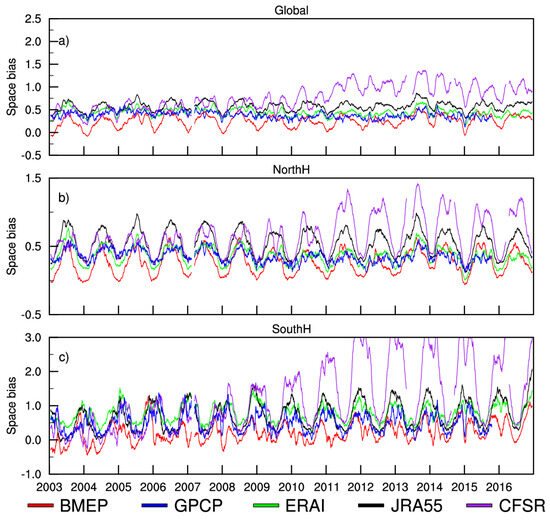The time series of spatial bias between CPC-U data and each gridded daily precipitation datum from 2003 to 2016 over the (a) global land area (60°S–90°N), (b) northern hemisphere land area (0°N–90°N), and (c) southern hemisphere land area (60°S–0°S). (A 31-point smoothing was applied to all lines to enhance the distinguishability of the lines).