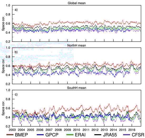 The time series of the spatial correlation coefficient between CPC-U data and each gridded daily precipitation datum from 2003 to 2016 over the (a) global land area (60°S–90°N), (b) northern hemisphere land area (0°N–90°N), and (c) southern hemisphere land area (60°S–0°S). (A 31-point smoothing was applied to all lines to enhance the distinguishability of the lines).
