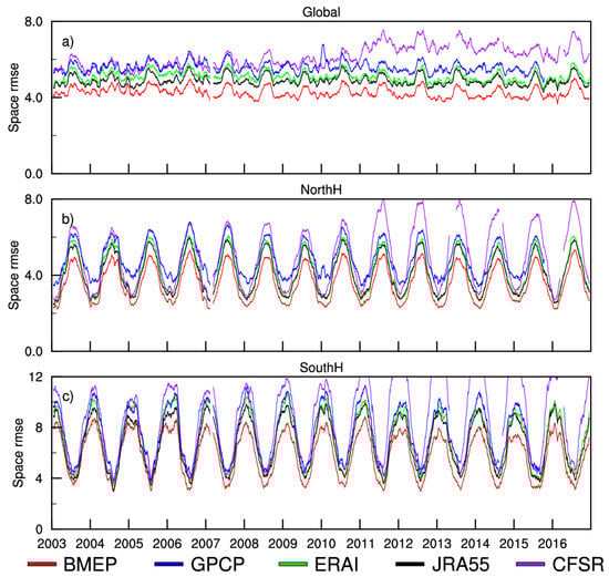 The time series of spatial RMSE between CPC-U data and each gridded daily precipitation datum from 2003 to 2016 over the (a) global land area (60°S–90°N), (b) northern hemisphere land area (0°N–90°N), and (c) southern hemisphere land area (60°S–0°S). (A 31-point smoothing was applied to all lines to enhance the distinguishability of the lines).