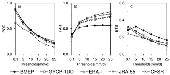 Figure 9 presents the results of POD, FAR, and ETS for five different gridded products across varying daily precipitation thresholds. As the thresholds increase, all gridded products consistently exhibit a decrease in POD and an increase in FAR values. This finding aligns with earlier studies [22,35,40] indicating that identifying heavy rainfall is more challenging than detecting light rain for both merged and reanalysis precipitation products. When considering thresholds ranging from 0.1 to 10 mm/day, BMEP, JRA-55, and CFSR clearly outperform GPCP-1DD in detecting rain occurrence (Figure 9a). Furthermore, the skill of GPCP-1DD deteriorates at a slower rate compared to that of BMEP, JRA-55, and CFSR, resulting in higher POD values for thresholds exceeding 20 mm/d. The FAR of BMEP remains relatively stable around 0.55, significantly lower than that of other datasets for thresholds exceeding 5 mm/d. Conversely, the FAR values of GPCP-1DD and CFSR rapidly escalate, exhibiting substantially higher levels than other gridded data (Figure 9b). These findings highlight BMEP’s ability to achieve the lowest false alarm ratios in detecting medium to high precipitation rates across global land areas. To assess the overall capability of detecting rain events, the ETS is evaluated. BMEP exhibits an increasing trend in ETS scores for light rainfall events, reaching its peak at a threshold of 5 mm/d. Moreover, BMEP consistently maintains significantly higher ETS scores than other products, gradually declining as the threshold increases (Figure 9c). The superior performance of BMEP in ETS scores can be attributed to its substantially lower number of false alarms. This indicates that BMEP excels in successfully identifying daily precipitation, particularly for moderate and heavy rain events.