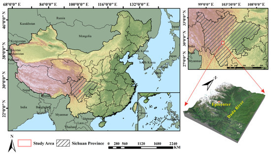The Ms 6.8 earthquake occurred on 5 September 2022 in Luding County, Ganzi Prefecture, Sichuan Province, at a source depth of 16 km, with the epicenter located in the town of Moxi, Luding County, at the geographic coordinates of (29.59°N, 102.08°E) (see Figure 2). The seismogenic fault is the Xianshui River Rift on the southeastern edge of the Tibetan Plateau, and the source mechanism is a strike-slip type [27]. The earthquake induced a large number of geological hazards, causing collapsed houses, roads and bridges, as well as casualties [8]. As of 14 September, relevant data reflect that this earthquake caused 97 deaths, 423 injuries and 30,317 emergency relocations and caused economic losses that are estimated to exceed 20 billion yuan [28].