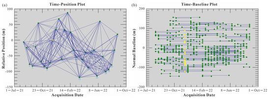SAR imagery from the year prior to the earthquake was selected as the study data, and the temporal baseline threshold was set to 120 days. The spatial baseline threshold was set to 2%, resulting in a total of 248 interferometric pairs (see Figure 4). The yellow dots represent the imaging time of the reference master image, and the green dots represent the imaging time of the remaining 32 view images.