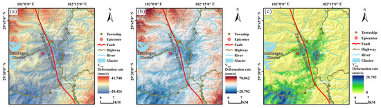 As shown in Figure 6, Figure 6a shows the LOS deformation rate , where negative values indicate the direction away from the satellite’s line of sight, which, in reality, is represented by surface subsidence (sinking), and positive values indicate the direction close to the satellite’s line of sight, which, in reality, is represented by surface uplift (lifting). Figure 6b shows the deformation rate projected to the steepest slope direction , and the average deformation rate ranges from −28.702 to 70.062 mm/a. Positive values of these indicate that the slope moves upward in the direction of the steepest slope, which obviously does not conform to the natural law. The corresponding positive areas were analyzed for possible snow and ice changes, vegetation growth, etc., and therefore, the positive areas were filtered accordingly. The negative portion of the deformation rate is retained to form ( indicates corrected ) (Figure 6c). These data reveal that there are some unstable slopes in the region, and such slopes are prone to landslide disasters under the action of earthquakes. The standard deviation of is 3.012 mm/a, which is usually considered an indicator to identify the active area [33,34]. Therefore, the rate range of 3.012 mm/a is specified as a stable slope in this study.