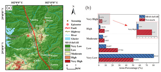 Results of surface deformation zoning: (a) SBAS-InSAR landslide susceptibility classification results; (b) Comparison of SBAS-InSAR and Newmark method area percentages for each zoning class.