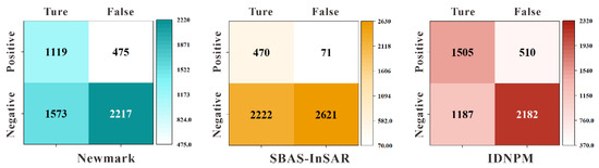The confusion matrix is a tool used to evaluate the performance of the classification model. According to the values of the confusion matrix in Figure 11, it is shown that the accuracy of true positives and true negatives in landslide disaster maps can be effectively improved, and false negative and false positive errors can be reduced to a certain extent by using the InSAR deformation based on the Newmark model.