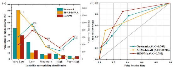 The AUC value is the area enclosed by the ROC curve and the coordinate X-axis, and the general value is less than 1. The value closer to 1 indicates the higher accuracy of the model. Next, we use the ROC curve to further evaluate the classification ability and robustness of the model. First, the area percentage of each susceptibility class is calculated, and the number of landslide points in these classes is counted. The specific results are shown in Figure 12a. According to these data, we can observe that the corresponding area proportion gradually decreases with the increase in the susceptibility class. According to the number of landslide points, there are more landslide points and a higher landslide density in the high- and very-high-risk areas of the traditional Newmark model and IDNPM, which indicates that the overall prediction accuracy of these two models is higher. The ROC curve is then plotted, and the AUC value is calculated (see Figure 12b). The AUC value of the IDNPM is higher, with a gain of 10.296% compared to the conventional Newmark model. This gain is considerable, and in practical applications, 1% or 2% increments in accuracy control the final evaluation results of landslide susceptibility [51,52]. Also, we observed that the zoning result of SBAS-InSAR also has an AUC value of 0.715, which is slightly higher than that of the conventional Newmark method. However, according to the data in Figure 12a, it can also be found that a large number of landslide sites are not in the danger zone. Moreover, the combined analysis of the recall and F1-score values also confirms its weak performance in predicting landslides. The reason for the larger AUC value is that the SBAS-InSAR zoning is more accurate for non-landslides. Therefore, when assessing the accuracy of the landslide susceptibility model, there may be limitations based on the AUC values alone, and data such as the confusion matrix should be considered together for joint analysis and argumentation.