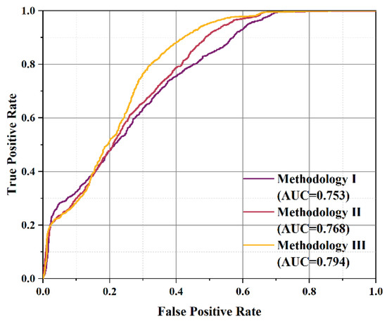 ROC curves and AUC values of each model: Methodology I involves the setting of various static safety discount factors; Methodology II focuses on setting the displacement amplification factor; and Methodology III considers the annual cumulative deformation value.