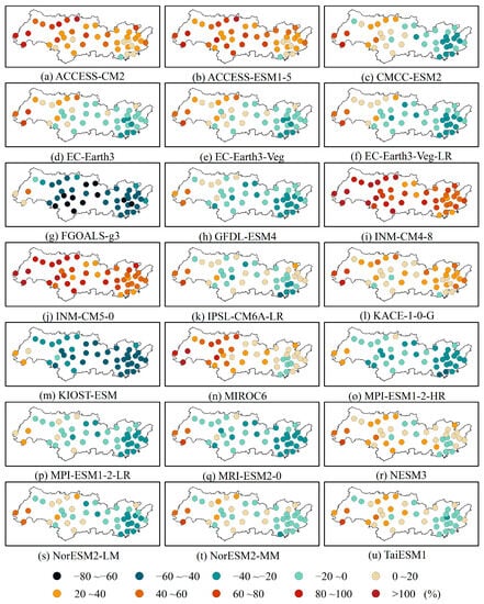 Spatial pattern of the relative bias between the CMIP6 GCMs and the observations derived from 1995 to 2014.