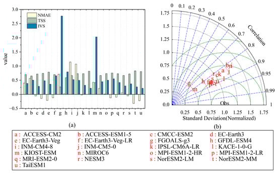 where STDm and STDo are the standard deviations of the GCM simulations and observations, respectively. Lower IVS values signified the more accurate reproduction of the interannual variability in CMIP6 models.