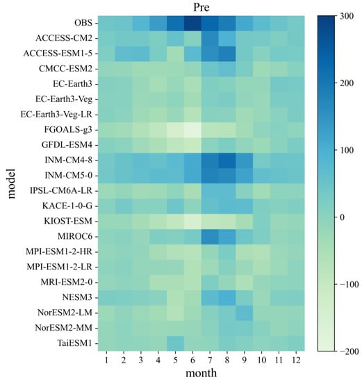 The bias of precipitation relative to the observation during the period 1995–2014 for each month and model. OBS, monthly precipitation observation.