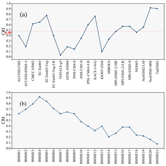Comprehensive rating index (CRI) values for 21 GCMs (a) and 21 multi-model ensembles (b). The red dotted line is the median.