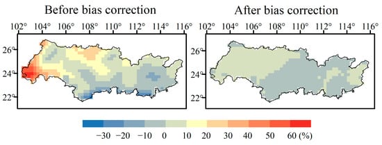 The BMME approach is widely recognized as an effective way to reduce uncertainties in individual model simulations, thereby improving the accuracy and credibility of predictions [46,66,67]. To facilitate a more accurate analysis of future precipitation changes in the PRB, we utilized the BMME method to mitigate biases in CMIP6 GCMs simulations. It is necessary to point out that when performing the current analysis, we only employed a simple multiple models mean and did not consider the weights of the individual models.