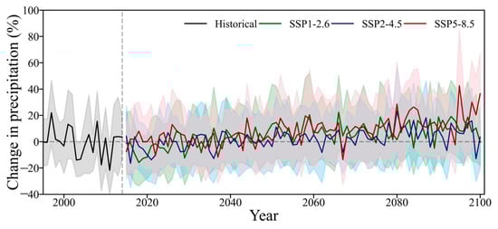 The trends of annual precipitation under the three scenarios during the period 2025–2100 were analyzed using the MK test and Sen’s slope (Table 2). There was a noteworthy and statistically significant increase in precipitation from 2025 to 2100, with a confidence level of 0.01, and the precipitation slopes exhibited differences between different scenarios. Specifically, the annual precipitation is predicted to increase by 22.42, 19.08, and 36.92 mm/decade under the SSP1-2.6, SSP2-4.5, and SSP5-8.5 pathways, respectively.