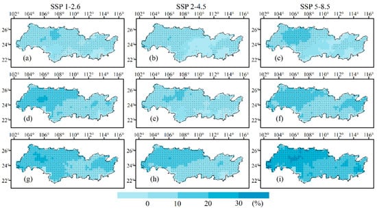Annual precipitation anomaly in the Pearl River Basin in the (a–c) near term, (d–f) medium term and (g–i) long term relative to the period 1995–2014 under three scenarios. A black dot in the grid indicates that at least 80% of the models in the grid area make predictions in the same direction as the signal.