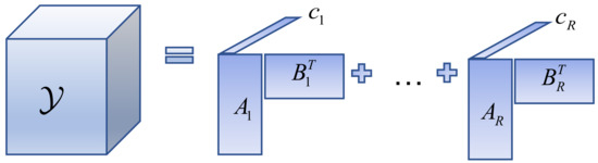 where , , , and . The LMN decomposition process is shown in Figure 3. The above description shows that the BTD is approximating the tensor by R component tensors, and each tensor is a Tucker of . If each component tensor rank is one, it can be treated as a CPD. Similarly, if , then Equation (3) is the Tucker model of . In other words, the BTD can decompose a tensor into the sum of multiple component tensors, and this process can be viewed as the CPD, while each component tensor decomposition is viewed as a Tucker decomposition. This overcomes the problem that each component tensor rank must be one in the CPD and lifts the restriction that the Tucker decomposition has only one component tensor. It is a combination of the CPD and the Tucker decomposition.