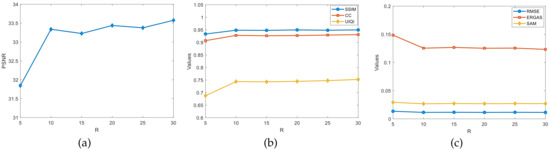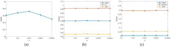 Eight algorithms, CNMF [18], Hysure [21], FUSE [22], SCOTT [25], IRSR [45], STEREO [47], BTD [54], and SCLL1 [58], were selected as comparison tests. Among them, SCOTT and STEREO are based on the Tucker and CPD models to solve the MHF problem, respectively; the BTD and SCLL1 are based on the BTD model to solve the MHF problem. Considering the different experimental environments of each algorithm, it is often difficult to achieve the effect in the original literature by directly adopting the parameter settings of the original literature under the current experimental environment, so this paper optimizes the parameters of other algorithms under the current experimental environment. Specifically, standard normally distributed pseudo-random numbers are used as initialization values for all algorithms, and the optimal parameter values are selected through ablation experiments; the hyperspectral decomposition threshold in the CNMF experiments is set to , the multispectral decomposition threshold is set to , and the outer recirculation decomposition threshold is set to . The value of the weighting parameter in STEREO is set to . The regularization parameter is set to and in SCLL1, and the parameters of the other algorithms that are not mentioned in the original text are used to set the parameters. The CPU in the experimental equipment is Intel(R) Xeon(R) Gold 6154; the RAM size is 256G. The operating system is 64-bit Windows 10. The experimental platform is Matlab R2017b.