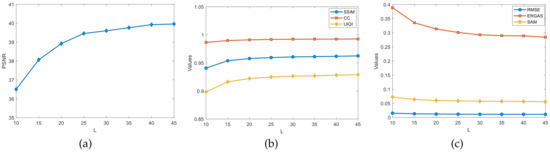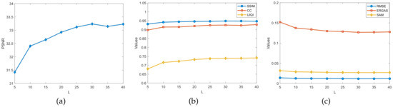The universal image quality index (UIQI) [70] is specifically used to detect the average correlation between the reference image and the fused image. If the fused image is closer to the reference image, the UIQI value is closer to a value of one, which means a better reconstruction effect. The definitions are as follows.