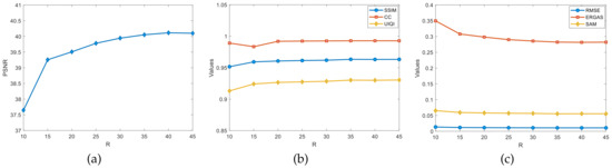 The structural similarity (SSIM) is used to calculate the structural similarity between the HRHS and the reference image in the spatial domain [69]. The SSIM ranges from −1 to 1. When the two images are identical, the SSIM value is equal to one. The definitions are as follows.