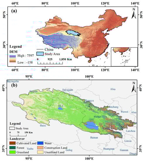 The location of the Qilian Mountain Watershed: (a) geographical location and digital elevation model of the study area in China; (b) spatial distribution of land use types, administrative boundary of the study area, and the two main lakes—Hala Lake (HLL) and Qinghai Lake (QHL).