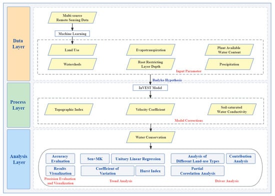 The Theil–Sen median trend and Mann–Kendall method (Sen + MK), unitary linear regression, coefficient of variation, and HURST Index methods were utilized to analyze the interannual variation and fluctuation characteristics, spatial pattern, and dynamic trend of the water conservation service function over the QLM from 2000 to 2020 on the basis of the precision evaluation and visualization of the dataset. Multivariate evaluation techniques of land class analysis, partial correlation analysis, and contribution degree analysis were used to quantitatively analyze the impacts of various land use types and meteorological factors (precipitation, potential evapotranspiration, and surface temperature) on regional water conservation. Realistic recommendations were obtained using the temporal and geographical fluctuations in the water conservation service function and the quantitative effect of the driving forces. Figure 2 provides an overall framework flowchart illustrating the methodology employed in this study.