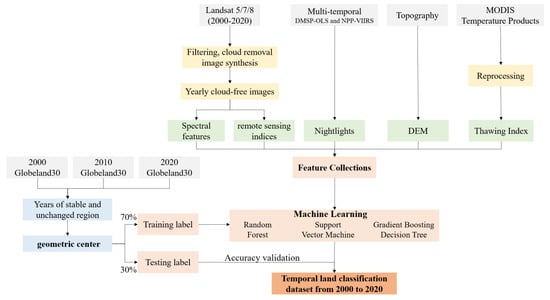Therefore, this paper selected the thawing index and nightlight as predictors to represent the extent of permafrost degradation and the intensity of human activities, respectively. In addition, spectral features (bands: red, green, blue, NIR, SWIR1, and SWIR2) and ten remote sensing indices obtained from Landsat images, including NDVI, NDWI, etc., along with topography were selected as predictors. All these aforementioned parameters were combined to make feature collections. Additionally, the labels were selected from the geometric center of the long-term stable and unchanged regions of the GlobeLand30 temporal datasets. Of all of the labels, 70% was randomly collected for the model’s training, and the other 30% was utilized for the accuracy’s validation. Different machine learning models were established and estimated, and the optimal one was selected for mapping the temporal land classification dataset based on the accuracy of the evaluations. Figure 3 provides a flowchart of the construction of the temporal land classification datasets.