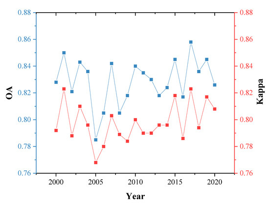 The accuracy and kappa coefficients of the land classification from 2000 to 2020.