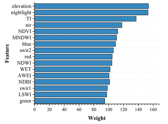 In this study, the random forest weight analysis method was utilized to investigate the weights of different features (Figure 5). The results reveal that elevation, nightlight, and thawing index exhibited the highest weights, providing evidence that human activities and the process of glacier and permafrost melting, indeed, had a significant impact on land cover during the period from 2000 to 2020.