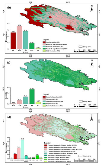 The temporal trend distribution of changes in water conservation trends from 2000 to 2020 in the QLM region: (a) spatial distribution of water conservation trends depicted using the unitary linear regression model; (b) fluctuation pattern of water conservation assessed with the coefficient of variation method; (c) dynamic change trend of water conservation derived using Theil–Sen median trend and Mann–Kendall method; (d) forthcoming changing trend in water conservation predicted using the Hurst Index method of R/S analysis.