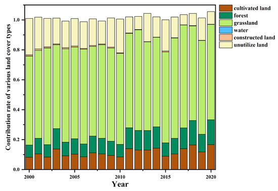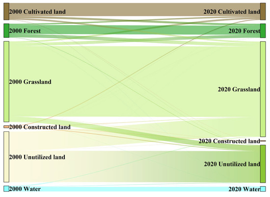 Year-to-year variations in vegetation-cover-induced changes in land use patterns have substantial implications for the ecological and ecosystem service functions of the environment [66]. The analysis of the land use pattern transitions in the QLM during the period from 2000 to 2020, as shown in Figure 8, reveals that in the development stage, construction land was mainly expanded at the expense of cultivated land, forest, grassland, and other ecological land [67]. In the ecological restoration stage, the policy of converting cultivated land to forests was put into execution, effectively increasing the regional coverage, leading to improved soil runoff and water-conserving capacity after more than a decade of vegetation restoration [68].