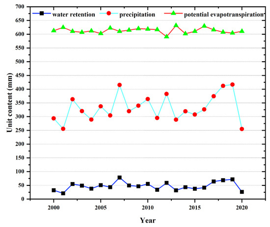 Based on the principles of water balance, the InVEST water yield module combined with the water conservation model assumes that on the raster cell catchment area, precipitation minus evapotranspiration leaves in the form of runoff. The model does not differentiate between surface runoff and subsurface runoff [55], instead focusing on simulating the ecosystem’s capacity to retain water at a specific spatial and temporal scale, which directly relates to the land use pattern. Variations in water yield among land classes mainly stem from differences in soil moisture, evapotranspiration capacity, deadfall thickness, and canopy interception [56,57].