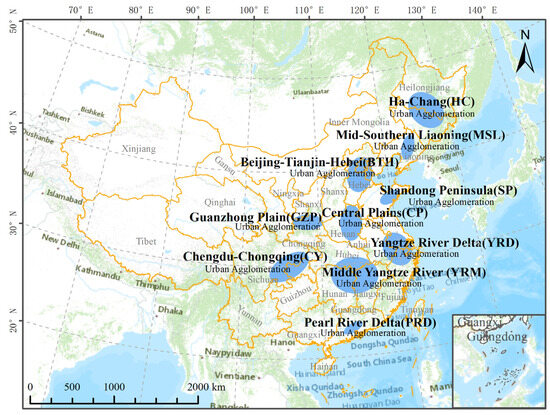 As shown in Figure 1, the study area mainly includes ten urban agglomerations with high urbanization and economic development levels in China. These ten urban agglomerations are as follows: the Beijing–Tianjin–Hebei (BTH), the Yangtze River Delta (YRD), the Pearl River Delta (PRD), the Middle Yangtze River (YRM), the Chengdu–Chongqing (CY), the Central Plains (CP), the Shandong Peninsula (SP), the Guanzhong Plain (GZP), the Ha-Chang (HC), and the Mid-Southern Liaoning (MSL).
