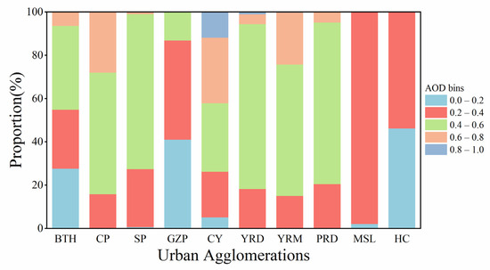 Figure 4. Frequency of occurrence of various AOD levels in ten urban agglomerations.
