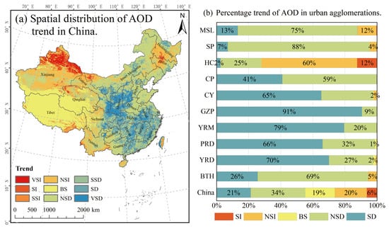 Figure 6. Trends in the annual average AOD: (a) spatial distribution of the AOD trend in China. (b) Percentage trend of AOD in the urban agglomerations. VIS: Very significantly increased, SI: Significantly increased, NSI: Nonsignificantly increased, BS: Basically stable, NSD: Nonsignificantly decreased, SD: Significantly decreased, and VSD: Very significantly decreased.