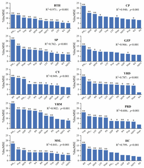 Figure 7. Order of variable importance, regarding variables and AOD concentration, using the Random Forest model in ten urban agglomerations: * p < 0.05 and ** p < 0.001. RH: relative humidity, Tmp: temperature, Prcp: precipitation, WS: wind speed, DEM: digital elevation model, NDVI: normalized differential vegetation index, LST: land surface temperature, GDP: gross domestic product, PD: population density, PM2.5: particulate matter with an aerodynamic diameter less than 2.5 μm, Slope: slope.