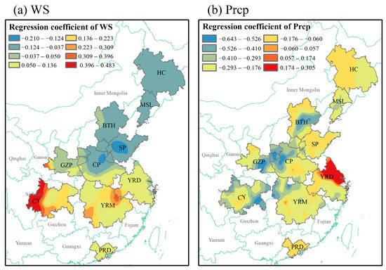 Figure 8. Spatial distribution of regression coefficients between meteorological factors ((a) WS: wind speed, (b) Prcp: precipitation) and AOD concentration.