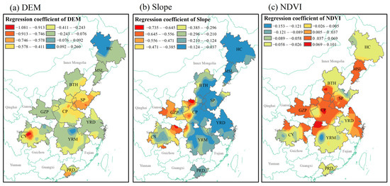 The regression coefficients of the terrain surface factor are shown in Figure 9. The area of negative influence, regarding DEM on AOD, was larger than the area of positive influence, with regression coefficients ranging from −1.081 to 0.260 (Figure 9a). The strong negative impact was mainly concentrated in the center of CY, whereas the areas with an intense positive impact occurred in the northwestern part of HC. The influence of Slope on the AOD of the urban agglomerations was negative (Figure 9b). The strong negative impact mainly appeared in the western region of the CP, whereas the intensity of the negative influence in the area east of the CP was relatively weak (0.037–0.124). The negative effect of NDVI and AOD was mainly observed in PRD, YRM, HC, CY, SP, and some parts of BTH (Figure 9c); this indicates that vegetation in these locations provided favorable conditions for the reduction of aerosol particles [4]. Although NDVI produced positive effects for AOD in GZP and CP, perhaps because the urban and built-up areas encompass a vast area, vegetation affects the urban airflow, reducing the dispersion of pollutants, and human-induced aerosol particles aggregate more in these areas [80]. In contrast to other influencing factors, however, the overall intensity of the effect of NDVI on AOD in urban agglomerations was weak (−0.121 to 0.101).