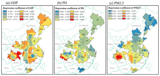 Figure 10. Spatial distribution of regression coefficients between socioeconomic factors, the pollution indicator ((a) GDP: gross domestic product, (b) PD: population density, (c) PM2.5), and AOD concentration.