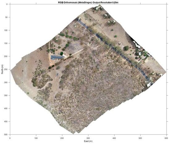 The second data set, taken from what are referred to as the PEGS sites, was observed between 12 December 2019 and 29 January 2020. These data were observed in support of a study into the complex relationship between local ground temperature, flora density/height/prevalence and distance from the edge of the scrub (unpublished). This data set comprises three sites, referred to as Kaiserstuhl, Bonython and Hale, which had a similar geomorphology: native eucalypt trees and low shrubs covering undulating hills. There were roads and other manmade objects (tracks and buildings) nearby. An orthomosaic image of the Hale site is shown in Figure 2. As with the Goat Farm data, the UAV flights took place between 10 a.m. and 2 p.m. local time. Once again, there was no precipitation. Each site covered between 10 and 15 Ha.