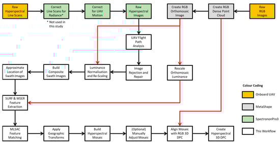 UAV hyperspectral sensing has matured rapidly in recent years [,]. However, its routine application has been traditionally constrained by a lack of automation for streamlining the image analysis []. That is, until recently a great deal of effort has been required to manually co-register imagery and ground control points (GCPs). To realise their full potential, UAV-based hyperspectral sensing systems need to provide radiometrically and geometrically accurate observations that can be post-processed quickly and with confidence. However, despite significant progress in fusing the hyperspectral data acquired by UAVs [,,,,], there appears to be no method that automatically, rapidly and robustly georectifies and mosaics hyperspectral data cubes and then converts the result into 3D hyperspectral point clouds. Moreover, in an ideal world, such a program would operate in batch mode on a ‘standard’ laptop, i.e., the software would process data with minimal human intervention on modest computational facilities. In terms of benefits, as well as adding efficiency to the data processing of scenes observed using pushbroom hyperspectral sensors, the 3D point cloud adds geometric features to any analysis. That is, it helps in the examination of hyperspectral data distribution relative to reconstructed surfaces, and thus informs the approach to non-trivial tasks such as modelling complex surface reflectance characteristics, including specular reflections, inter-reflections, transparencies and sub-surface scattering under real-world conditions.