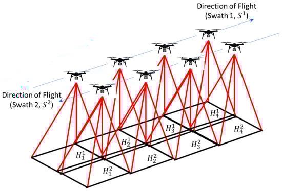 Using the centroids of the GNSS coordinates (Figure 4), , , , which represent the corners of each hyperspectral image/cube, , all of the cubes/images that align with each leg (long and short) of the UAV flight are then automatically grouped together into potential swaths. That is, images are combined and processed together in groups, , where is the number of images in the swath (noting, despite the lawnmower flight path, due to the asymmetry of images during turns, each swath does not necessarily contain an identical number of images).