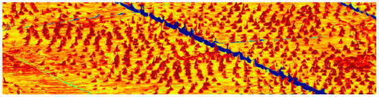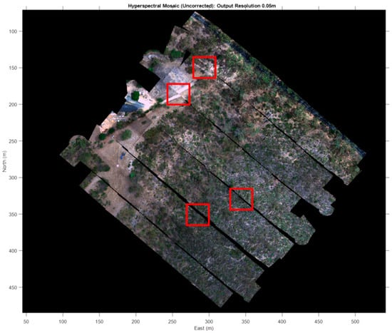 Commencing at the first image of the first swath, , each of the (Figure 5) hyperspectral images are processed in turn. First, the extrema, , are computed from , the coordinates of the corners of the hyperspectral image. Then, the image is resampled into a matrix of dimensions, , where , and . Next, this resampled matrix is allocated to a sub-set of pixels, , where , , and , within an (initially blank) matrix of dimensions . Although this is an inaccurate placement, not least because the corners of the hyperspectral images do not form a rectangle, this is performed because it is computationally much faster to allocate a rectangular × × sub-block of pixels in memory than to accurately assign, pixel-by-pixel, a slightly tilted, trapezoidal image to the correct elements within the relevant matrix needed to form part of the composite image representing each swath.
