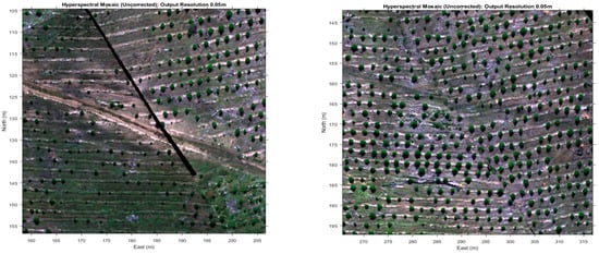 The accuracy of the results was evaluated using a combination of qualitative and quantitative factors. The qualitative assessment of the georectified hyperspectral mosaics was carried out by visually inspecting the imagery for gaps, mismatches, deformations, duplicates and discontinuities (Figure 6). Initially, no manual adjustment was applied, i.e., Figure 6, Figure 7, Figure 8, Figure 9, Figure 10, Figure 11, Figure 12, Figure 13, Figure 14, Figure 15 and Figure 16 show results for the automated workflow only.