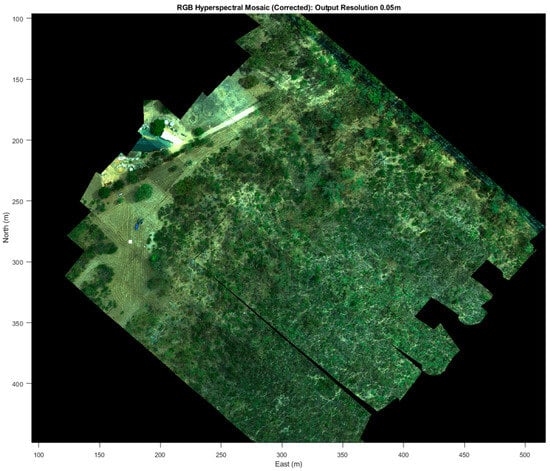 Georectified hyperspectral mosaic formed using the workflow described in this paper (note: a few single images at the ends of some swaths shown in Figure 9 have been auto rejected). Also, the very narrow side overlap (<5%) has resulted in a few gaps between swaths.