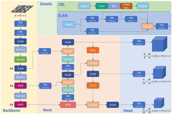 In the backbone, represents the input images. It is downsampled by two CBL modules (consisting of convolutional layers, batch normalization, and the LeakyRELU activation function [39]); the convolution kernel size is , and the stride is set to 2. Moreover, the SimAM attention mechanism is embedded after max pool to help the network focus on key features, which can better represent important information in the input images to enhance the performance and the expression ability of the model. Then, we used the VNFE module to make the feature mapping improved, accelerate the training and convergence speed, and make the model more lightweight. The SPPE module is used to extract feature vectors of objects with multiple scales and expand their receptive fields. Feature maps of size , , and are extracted from the backbone P3, P4, and P5 layers, respectively, and sent to the neck network, where feature fusion is performed. As we all know, low-level features encompass local information such as edges and textures of objects, providing more spatial information, but limited semantic information. On the other hand, high-level features tend to possess richer semantic information. To address the loss of feature information due to downsampling and to make the neural network more robust and accurate for recognition, the features of the P3, P4, and P5 layers are fused by the CACL module.