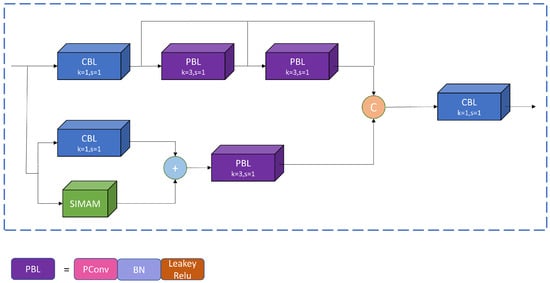 where X represents the feature input, denotes a convolution operation with a filter size and stride of 1, is a PConv operation with a filter size of and stride of 1, SimAM represents the attention operation, and ⊕ is the concatenate operation.