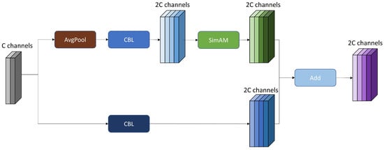 Using a CBL with only a 3 × 3 convolution for downsampling can result in information loss and decrease feature quality. To minimize the information loss caused by downsampling, we embedded the CACL module within the network, allowing the feature map to retain more feature information. In the first branch of the CACL, compared with the max pooling layer, using the average pooling layer can better preserve the spatial information of the feature map and effectively utilize the global information. After that, a convolution is used to deepen the network, introduce more nonlinearity, and enhance the neural network’s expressive capability without expanding the receptive field. The feature map’s channel count is doubled as well. Then, the network model focuses on the feature regions with higher discrimination by using the SimAM attention mechanism.