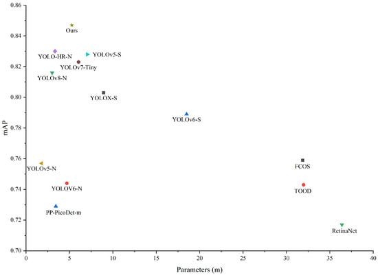 By comparing the , , and with each model, we found that the gains of our model mainly came from medium objects and large objects. Although the accuracy on medium objects was the same as that of YOLOv5-S, the accuracy on and improved by 8.9% and 4.1%, respectively. Despite the MHLDet model having 3.5 M more parameters compared to YOLOv5-N, it remains categorized as a lightweight model.