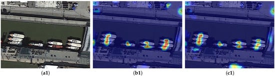 Figure 8 depicts the visual comparison of the heat map of the baseline with our proposed method, and it can be seen that our proposed method excels in predicting objects with only partial features and objects that are close to the surface color. To be specific, the heatmap’s colors transition from blue to red on the images, symbolizing the probability of target presence increasing from low to high. Blue areas indicate the potential absence of targets, while red regions signify a high likelihood of target presence. Figure 8(b1–b3) are the results of YOLOv7-Tiny, and Figure 8(c1–c3) are the results of our proposed model. From Figure 8(b1,c1), it can be observed that we also had a heatmap representation on the ship just below, where only a portion of the features was exposed. As shown in Figure 8(b2,c2), YOLOv7-Tiny overlooked the middle vehicle, where our model correctly annotated it. From Figure 8(b3,c3), it is evident that our model provided more-accurate and continuous annotations for vehicles in shadow. As a result, our model can accurately depict the distribution of data. The visualization detection results are shown in Figure 9.